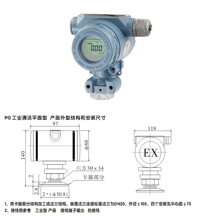 3、確定螺紋接口:常用壓力接口為M20X1.5,如果在特殊場合下使用應考慮防爆以及防護等級。